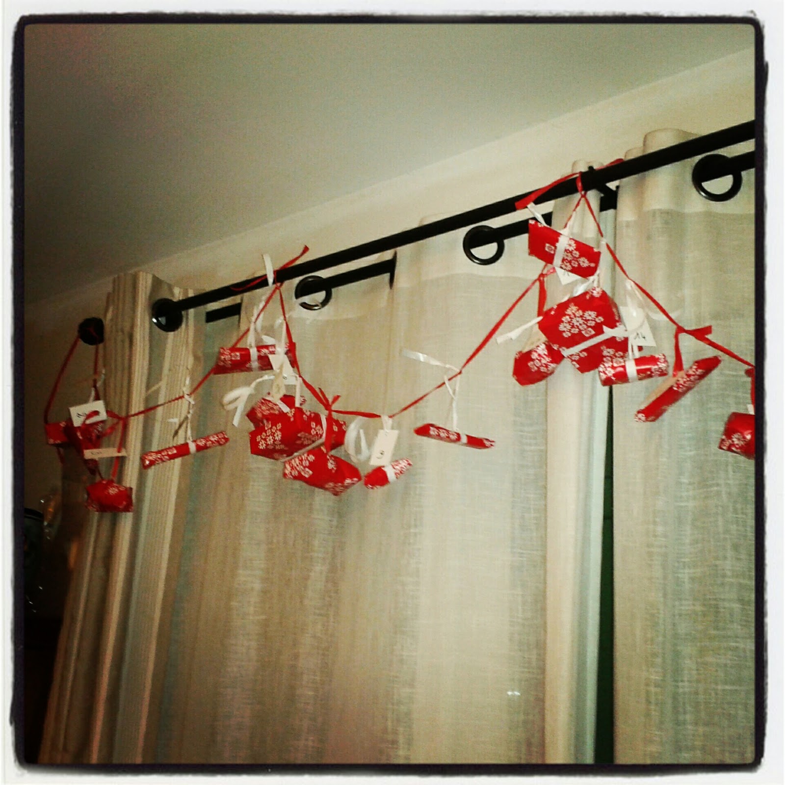 Et bien non, ce n'est pas comme ça qu'il faut le voir ! D'abord je suis organisée (et pas en retard j'en conviens) car bizarrement monsieur mon mari n'est pas d'une grande aide dans les divers préparatifs de cette période festive... Et puis n'est-ce pas joli cette guirlande rouge et blanche ? Enfin, admettons le, c'est un fabuleux moyen d'apprendre la patience, non !? Ok ce dernier argument est complètement fumeux lorsqu'on a 4 ans, qu'on voit 24 cadeaux pendus sur la fenêtre principale du salon........... Bon on va dire que ça lui fait réviser ses chiffres ! Non ça non plus c'est pas top comme argument ? Bon je vais réfléchir à des trucs plus solides pour l'année prochaine alors...